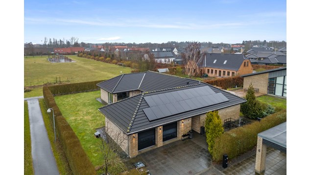 Villaen er opført i 2014 af HusCompagniet og byder på hele 222 velindrettede kvadratmeter. Hjemmet er designet med fokus på kvalitet, komfort og energieffektivitet, hvilket blandt andet ses i de gennemgående troldtektlofter, solceller og gulvvarme overalt.